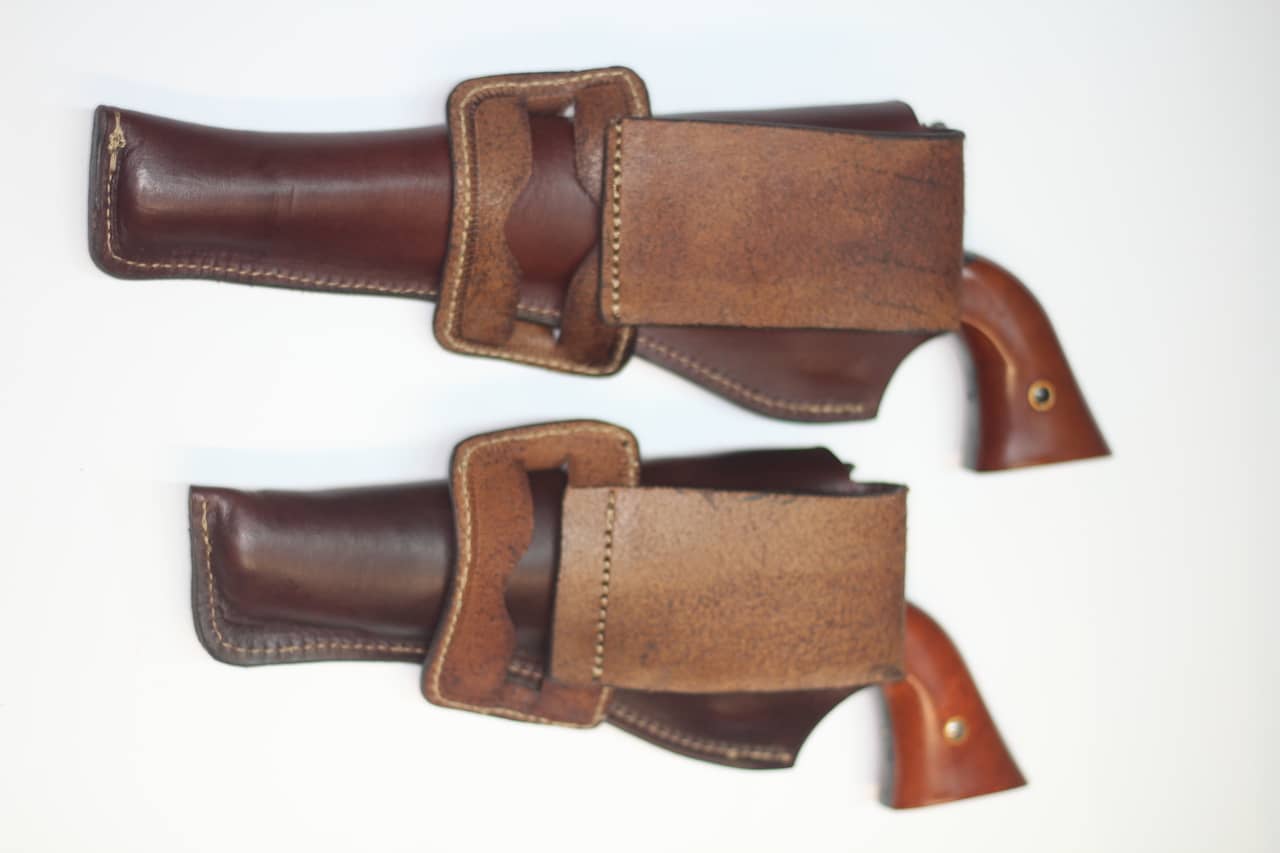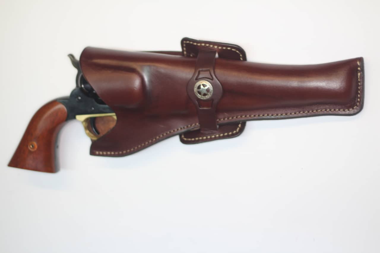 Kabura skórzana przeznaczona do czarnoprochowego Remington,Colt Army,Saa, 8 cali. Kabura otwarta może być zapięta paskiem przez kurek, wykonana została ze skóry bydlęcej wysokiej jakości, skóra tłoczona o grubości 4mm w kolorze brązowym