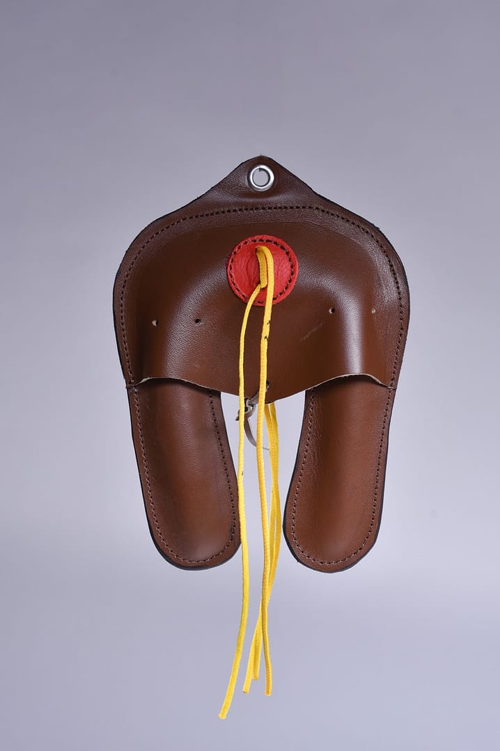 Wabidło duże jastrzębie wykonane z skór bydlęcych wysokiej jakości posiada sznurki do mocowania piór. Wymiary długość rzemienia 150 cm waga 300 g długość 23cm szerokość 16cm grubość 4cm