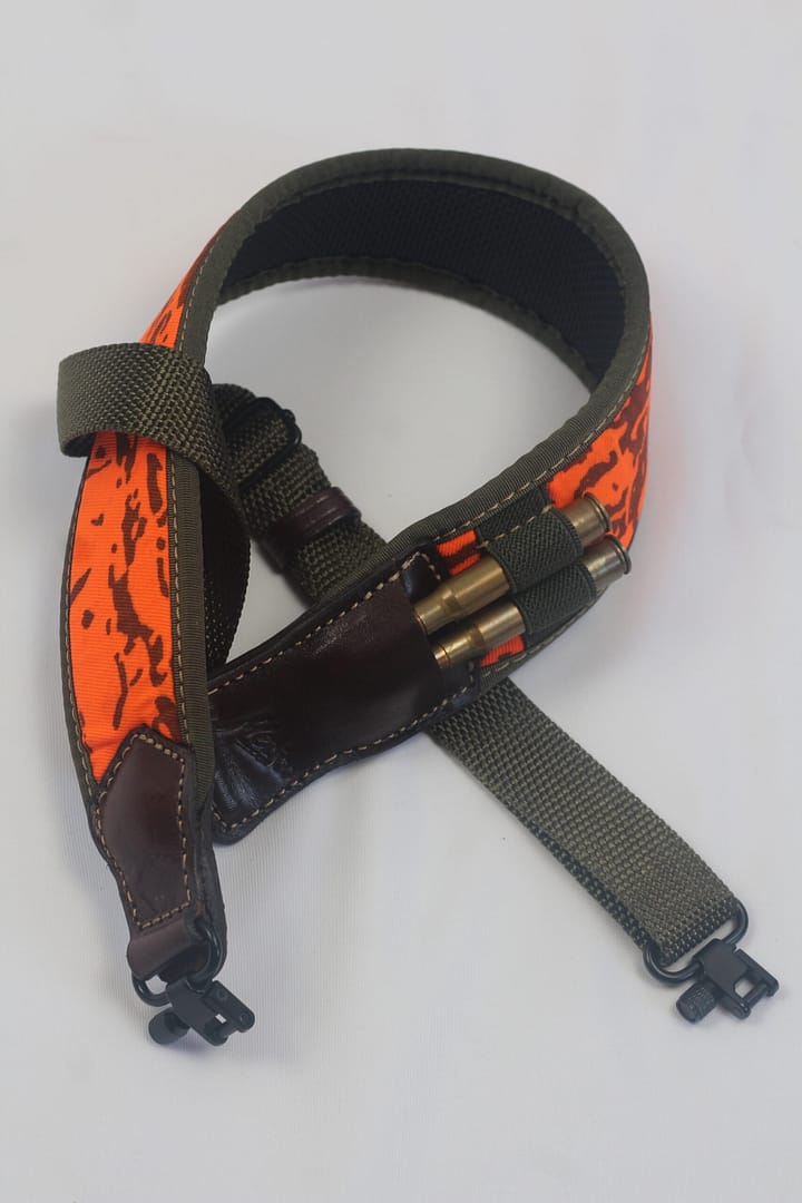 Pas do broni Myśliwskiej pomarańczowo -brązowy,na 2 naboje. Zapięcie na bączek (szybkie zapięcie). Wykonany z neoprenu,obszyty lamówką koloru oliwkowego. Wykończony skórą i bardzo mocną taśmą nośną. Szerokość 6 cm długość 115cm.